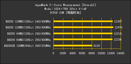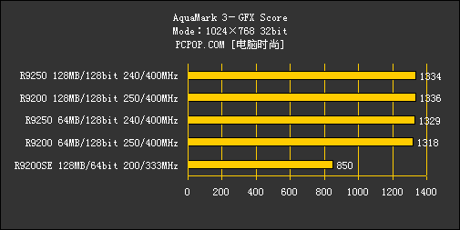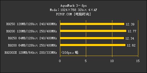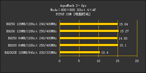 再对比一下Radeon 9200SE,由于其显存位宽只有64bit,而且核心/显存频率都比Radeon 9200低不少,出现这样的成绩也就不奇怪了。至于显存容量,显然在Aquamark 3中有64MB就够用。