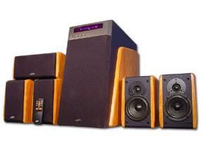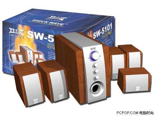冲击波SW-5101音箱外形优美典雅,整体为木质结构,外表是木纹的PVC贴皮。4个卫星音箱均为倒相式,有利于表现音乐的深度。中置音箱的尺寸与卫星音箱有少许差别,但整体的设计风格是统一的。低音炮音箱的功率为60W,峰值达到480W;而卫星音箱的功率为10W,峰值也达到480W。因此,无论您是听广播欣赏音乐还是观看影片,“冲击波”音箱都可轻松承担。