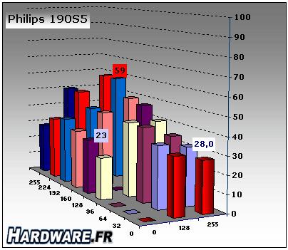 我们在可以看看上图,这是我们自己测试得出的飞利浦190S5 显示器的响应时间空间分布图,和上图不同的是,这部图表的柱状数值直接包括了上升沿和下降沿两部分的时间。我们可以看到最长的时间发生在两个较深灰阶的转换过程中,而从纯白到纯黑过程在最快的速度之列。