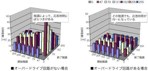 从该图表来看,Overdrive的确是卓有成效,一些响应时间高达80ms的灰阶转变过程被缩短到20ms以下。但是只要我们仔细观察,就会发现这幅图并不符合实际。我们看到该图表的典型“白-黑-白”响应时间同样被降低到10ms以下,这是不可能的,按照我们上面对Overdrive技术的分析,由于“白-黑-白”转变过程已经施加最大激励电压,所以该过程不会从Overdrive获取任何好处。作为厂商来说这样的宣传有些不负责任了。