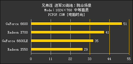 根据以往的评测经验,ATI的显示卡在《战地2》中会占据比较大的优势,这次仍然是如此,6600LE仅得到了23fps的成绩,几乎已经无法达到流畅的要求了。而在支持HDR的《兄弟连》测试中,相同档次NVIDIA的显示卡成绩全面超越了ATI,不过好在X550也能够达到将近30fps的帧速率,基本流畅运行游戏还是不成问题的。