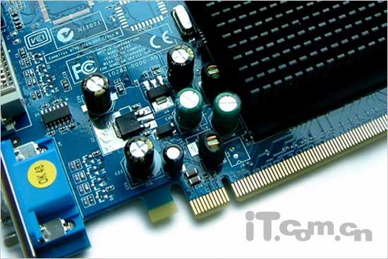 容量的电容和大型电感元件仍然主要集中在显卡PCB正面的上下两端,其位置间隔也比较均匀,这这是让显卡安全稳定工作的一个必要条件。采用显卡最为普通的全接口设计,在这里就不在多多赘述。