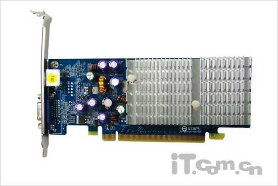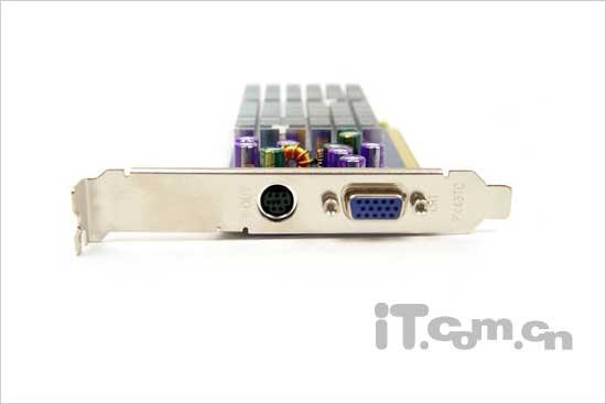 整块显卡由于是窄版设计的关系,整体看来比较细长,显卡上的电源电容都比较集中的分布在散热片附近,从而保证了显卡在运行中的稳定。由于采用刀版设计,所以显卡只提供了VGA接口和S-Video接口,没有提供DVI数字输出接口,但是作为一款入门级的廉价显卡,这样的设计也还是可以接受。