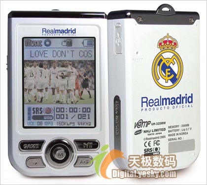 日本NHJ公司曾宣布发售过一款“皇家马德里纪念版”彩屏MP3播放器,这款MP3与目前国内市场上的丹丁DX-6出自于同一代工厂,只是“皇马纪念版”在外观上更为夺目。这款MP3除了支持MP3/WMA之外还支持OGG格式,采用1.9英寸的4096色STN屏幕显示,USB1.1接口。另外这款MP3还支持JPEG格式图片浏览、电子书阅读等功能。