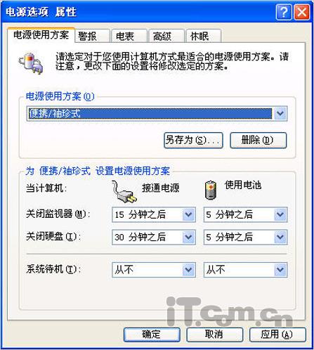除了这些硬件节能措施外,还有软件节能调节,即我们通常说的电源管理软件。最初的电源管理软件应该是Windows自带的Power options(电源选项属性)。Windows的电源管理提供家用/办公桌、便携/袖珍式、演示、一直开着、最大电源管理选项以及最大电池电力六个电源管理主题,可以根据实际使用中对性能和电力的要求选择合适主题。除此之外,Windows自带的电源管理软件还提供电脑休眠、待机等省电设定。