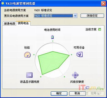 工业设计出身的索尼,时尚的领导者,产品的设计、做工无人可比拟,这就是索尼迷们偏爱索尼的原因。这样出色的笔记本电脑同样拥有出色的电源管理系统,VAIO笔记本电脑最初装备的电源管理软件是BatterScope,进入PII之后开始采用Power Panel。和所有VAIO的随机软件一样,这款电源管理软件界面清新,操作直观简易。通过调节显示器亮度、性能、可用设备以及风扇安静度中任一参数,电池使用时间相应发生变化,非常直观。在CPU具备SpeedStep功能的VAIO笔记本电脑上,PowerPanel兼有SpeedStep 的作用。