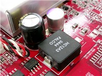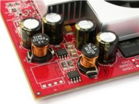 其次,在供电电路的用料上,该显卡采用了屏蔽线圈和大1000uF的容量直立电容,显存供电部分还使用了2组供电模块(但不是两相供电)。