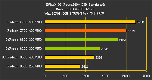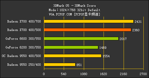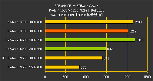 在最高的的1600x1200分辨率中,X700 TSOP显存带宽的瓶颈比较明显,但仍取得了2307的成绩,还是领先6200与超频后的9550。