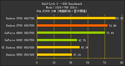 从测试成绩中可以看到,在标准的1024x768的分辨率中,Radeon X700 TSOP得益于完整继承了8PP/6VS的架构,比同频的9550性能高出近40%,比6200标高出近30%,足见显卡管线数量的重要性,也说明500MHz所提供的显存带宽基本满足核心的需要。考虑到1024x768是主流的分辨率,所以此处的测试成绩更具有代表性。