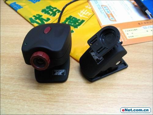 如果说“他”代表着可爱的话,那辉煌04增强版就是阳刚的代名词。辉煌04通体黑色给人以稳重的感觉,外壳采用的和“他”相同的材料,摸着同样舒服。最值得一提的是,辉煌04送了两个可拆卸底座,一个可以非常平稳的放在桌子等平面上,另一个一夹子的,可以夹在LCD的边框上什么的。 这两款摄像头的技术性能十分优秀,采用35万像素(硬件压缩引擎技术)的CMOS光学传感器,5层玻璃镜片技术,摄像头硬件压缩引擎技术,最大可以拍摄640*480的静态照片。有这样优秀的性能保障,极速的表现一定不会让我们失望的。