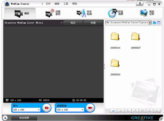 创新WebCam Live!Ultra摄像头除了具有正常的视频输出外,还具有照相和摄录功能。打开视频对话框以后,点击捕捉,就可以看到视频的图像显示画面,画面默认分辨为640×480。你可以通过画面下方的照片设置来调整照片的分辨大小,右侧圆形的相机图标,点击下去便可以自行拍摄照片。你可以手动选中想要的画面,拿稳摄像头,轻轻按动摄像头上方的拍照按钮,图像便轻松捕捉了,然后在画面右侧的文件夹中便可以看到所捕捉的图片了,整个拍摄过程完全掌控在您的手中,非常方便。还可以通过对话框来进行鼠标点击拍照,这样拍摄出来的照片不会因手拿不稳摄像头而影响照片效果。