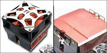 第三款要介绍的是同样来自tt的Thermaltake Volcano 11+ Xaser Edition散热器。Volcano 11+ Xaser Edition散热器的散热片采用了密集鳍片式的设计,密集式的薄型鳍片可以大大增加散热片的有效散热面积。在这块体积大小为70×66×30.8mm的散热片当中,就已经有大约40片鳍片了。散热器所装备的散热风扇具备第二代SmartFan技术,该技术允许我们通过外围的可变电阻来调节风扇的转速或者通过一个贴在处理器核心附近的热敏二极管实现自动调速功能(Thermaltake推荐用户使用自动调速功能)。散热器具备两种不同的外围电阻调节方式,一种是将调剂旋钮安置在扩展槽挡板上,需要占据用户机箱背面的一个扩展槽挡板位置,第二种则和Thermaltake先前推出的Volcano 11散热器一样,将调节旋钮安置在一个5.25英寸驱动器面板上。Thermaltake推荐我们将风扇安装在他们附送的支架上(有点像Pentium4处理器散热器那种安装方式)而不是直接扣在处理器上,需要特殊的装置方可固定稳当,对于超频发烧友来说还是相当合适的。
