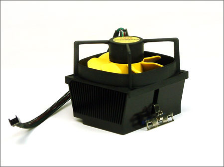 介绍完了Tt然后让我们来看一下来自国内的散热巨头九州风神的悍将,首先介绍的是九州风神的新品?蜘蛛侠。蜘蛛侠是一款支持AMD Socket462架构和英特尔塞杨图拉丁核心架构的静音型散热器,这款散热器最高支持到AMD Athlon XP 3200+、 AMD Duron 1.8GHz,支持AMD Sempron 2800+,并支持图拉丁核心的赛扬1.4GHz或更高。应该说,作为一款主要针对于Socket A架构的散热器,这款产品还是能够满足大部分用户的需要。这款散热器采用了黑色主体搭配黄色扇叶的设计风格,似乎与九州以往风格不太一样。看来在如今的市场,只有更加注重外观以迎合众多玩家的口味和要求,才会获得更好的反响。人性化的黑网包好了散热器的电线部分,使得机箱内部看起来更加整洁,一改往常散热器杂乱的感觉。再来看一下风扇部分,蜘蛛侠采用了80×80×25mm的倒挂式风扇,这样的技术使得这两款风扇在工作状态下几乎无声,也使AMD的散热方案具有了前所未有的安静。从风扇上边的贴纸还能看到“品牌风扇。三年质保“的字样,看来厂家对这款散热器的信心还是很足的。