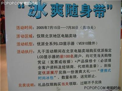 为了让冒着炎炎夏日到市场中选购液晶的朋友能有过一个舒适的夏天,从即日起至8月5日,凡在北京的电脑城卖场,都可以的得到优派赠送的小冰包一个。此次“冰爽随身带”促销活动,给消费者在炎炎酷暑中送去一份清凉。每天购买优派LCD的用户,凭当天“购物小票(发票或收据)+产品保修卡”均可获得便携时尚的“冰包”一个!先到先得,送完为止!