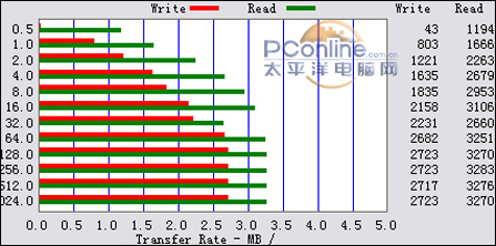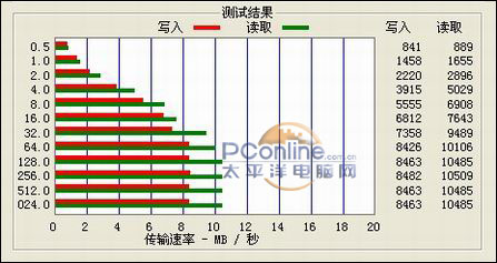 使用ATTO测试后得出SDMX1的最高写入速度为8.4M/S,最高读取速度为10.5M/S,可以说不负众望,在闪存式MP3中其传输速度可谓个中翘楚,跟一般USB2.0高速传输比起来,差距非常明显,也不枉SanDisk那么多年来的名号。