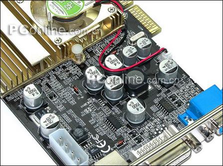 铭?狂镭9550黄金版G2采用传统的黑色PCB底板,全铝壳电解电容阵容,搭配特色的金黄色散热器。显卡搭配128M 128bit Hynix 4ns显存,默认频率为250Mhz/400Mhz,由于显卡带上4pin D口供电接口,这款显卡拥有不错的超频能力。