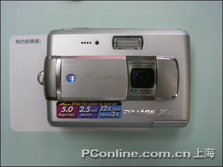 柯尼卡美能达 DiMAGE X60是柯美近期的上市的一款卡片式机型。该机型的最大特点是简单易用,开机迅速。她配有五百万像素的CCD,,内置潜望式3倍光学变焦镜头,光圈范围F 3.3 - 4.0。机子使用2.5寸大小的液晶屏幕,像素为11.5万。