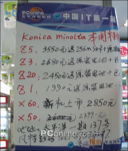 其中,柯尼卡美能达Z5的优惠最吸引。该机子现在套装销售是3550。按照一张256 MB的SD卡售价为一百七十元,一枚原装电售价两百多元。仔细算算,单这两样东西售价便达四百元。这样一台单机售价便是三千一百五十元。