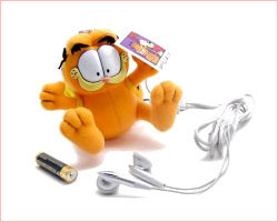 加菲猫相信大家一定喜欢吧,那可爱胖胖的外形,坏坏的表情博得很多女孩子的青睐,现在市面上有一款以加菲猫造型的MP3播放器,内置了128MB的容量,你可以通过加菲猫的腿来操作MP3播放器,电池只需要一个AAA电池可以提供8小时,同时还有其他几款造型的MP3,如小叮当等。