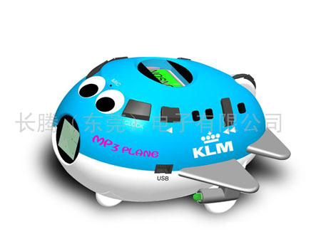 说过了女孩子喜欢的卡通玩具,轮到说说男孩子所喜欢的了。飞机!相信大多男孩子会喜欢它,以当一名飞行员为理想的男孩应该也不少吧。现在广东东莞的长腾电子有限公司推出了一款卡通飞机造型的MP3,非常可爱!它的型号是MD-510,这款卡通飞机造型的MP3可以播放音乐、录音并且还有时钟的功能,不听歌时还能当闹钟用的。