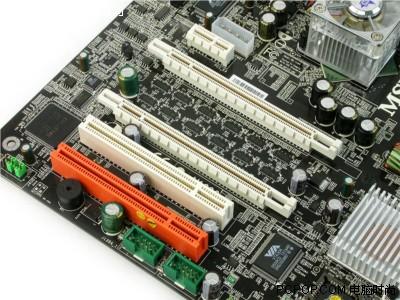 1、SLI部分。nForce 4 Intel Edition的最大卖点当然是其支持SLi技术,当接上两片支持SLi显示卡后,便可令两卡协同工作达到效能提升的目的,而MSI的RD部门却为P4N Diamond下了不少功夫,我们可以看到图中两条PCI-E绘图接口中间有不少IC,而且没有了切换SLi与Normal模式的转接卡,原来两条PCI-E绘图接口中间有不少IC能代替转接卡,用户只需在BIOS中设定就能选择x8+x8或是x16+x1。