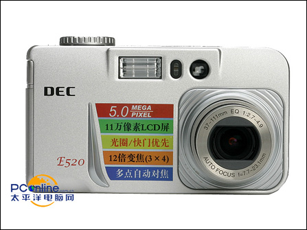 DEC E520对于许多消费者来说比较陌生,但它是一款高配置的手动曝光数码相机。E520采用1/1.8英寸的500万像素CCD以及3倍光学变焦镜头,这一高端的成像配置在一定程度上弥补了国产机型影像处理器上的先天不足,可有效提高成像质量。E520配备手动曝光功能,快门速度为8-1/2000秒,还可以拍摄640x480分辨率的MPEG4有声动画,功能上完全可以媲美国外品牌的机型。只是这款机型的LCD只有1.5英寸,外壳的做工也不太尽人意。