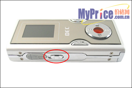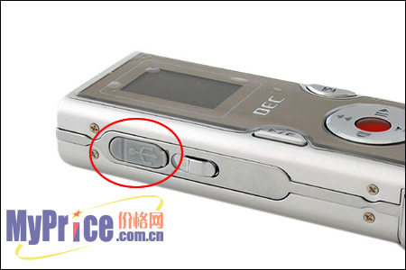 机身顶部设计有3.5MM耳机和LINE IN数据线两个接口,机器左边靠近HOLD键的为USB接口,上面覆盖有灰色保护罩,可以起到很好的防尘作用。