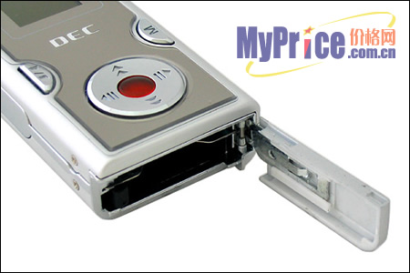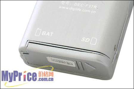 打开底部保护盖,可以看到其内部空间较大,这里是放置SD/MMC卡和锂电池的地方。通用的SD/MMC卡。F37R可以在固化内存的基础上可实现存储容量的无限扩展,这也是F37R的主要卖点之一。