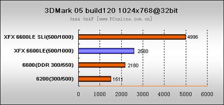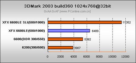 Geforce6600LE组建的SLI平台性能不俗,在经典的Athlon64 3200+ 平台带动下,3Dmark03分数达到11352,而最新的3Dmark05测试中几乎突破5K大关。3Dmark分数表现出来的性能已经相当于单卡的6800GT和Radeon X800XL的水准。