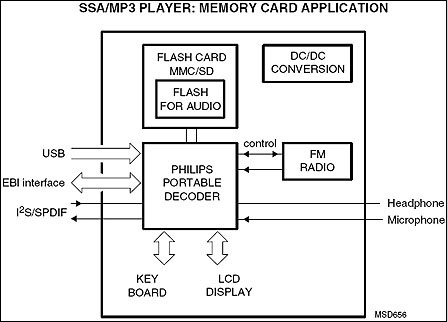 在了解产品之前,首先认识一下SAA775*系列芯片的概况,SAA775*系列共有SAA7750、SAA7751、SAA7752、SAA7753等,而在MP3中最为常见的是SAA7750解码芯片。该芯片内含速度高达73MIPS的24位DSP(Digital Signal Processing,数字信号处理)和32位ARM RISC处理器,可编程DSP架构,利用相匹配的嵌入式闪存,可进行相应的固件升级;支持多重音乐格式解码,支持解码速率为8Kbps - 320Kbps,信噪比90dB;兼容多段多档位EQ音效处理,包括3D定位音效和超重低音,高低音量均可任意调节;支持MP3编码Line-in直录功能;可外接SM(Smartmedia,智能卡)、MMC(Multimedia Card,多媒体扩展卡)、SD(Secure Digital,安全数据)等闪存卡,方便存储容量的扩充;内置了一个16位立体声音频ADC(模数转换器)和DAC(数模转换器),并且带耳机驱动,可以输出每声道12mW(16欧姆)的强劲功率;支持锂电池和普通碱性电池。