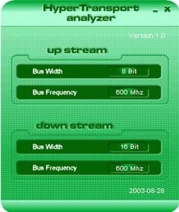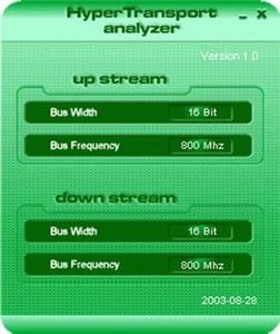 通过AMD提供的HyperTransprt analyzer软件可以看到K8T800确实可以实现16bit/800Mhz的传输,而且nForce 3芯片组仅可以提供上行8bit/600Mhz,下行16bit/600Mhz的传输。