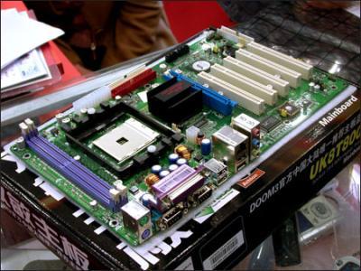 双敏UK8T800N也曾经是刷新主板最低价的一款主板,在时之初就得到了消费者的广泛关注。这款主板的规格和上面介绍的主板一样,不过在用料上有个小小的特点,就是在CPU供电电路中采用了固态电容,构成增强型两相供电回路。RTL8100C网络芯片和ALC655芯片分别为主板提供百兆网卡和6声道声卡功能。