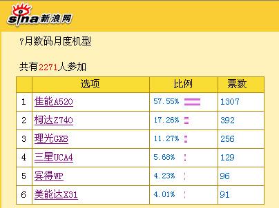 上图显示,经过一个月的评选,共有2271名网友参与投票。而从此次评选结果来看,以品牌优势为基础的佳能A520凭借1307张选票的绝对优势获得了这一期月度机型评选的冠军;第二名柯达Z740虽然在票数上远远落后于冠军机型,但由于其突出的10倍光学变焦性能,依旧得到了不少网友的青睐……。下面是7月份参选产品点评: