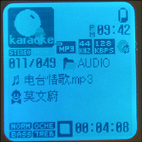 其中最引人注目的莫过于其卡拉OK功能,用户在播放音乐的时候可以使用内置的MIC或外接的MIC进行唱K,这样可以起到用户的声音与音乐混合的效果,M-1000还可以同步显示歌词进度,方便使用者对照,最多可以显示六行歌词信息,此外还可以进行MIC音量、音调、播放速度等设置,简直就是一个浓缩的功能机。M-1000采用内置锂电池设计,播放时间长达48小时,而仅要2.5小时就可以充满了。