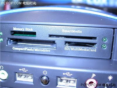 而在前置面板顶端,丰富的有些过分的功能接口,让我们只能作惊诧状。因为在前面板顶端不但有我们常见的电源开关、USB2.0接口、音频接口以及指示灯外,该款4203机箱还在上面集成了一个八合一的读卡器,可以分别读取CF/微硬盘、SD/MMC、SM以及记忆棒,并且还有四个指示灯,这无疑大大方便了拥有众多数码设备的用户。