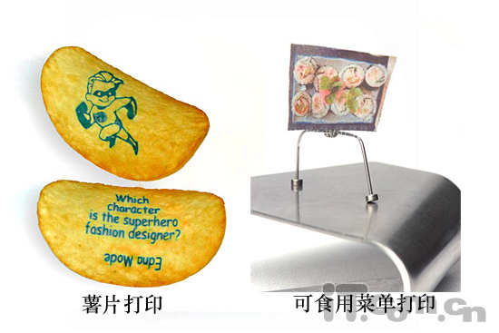 不过在薯片上打印图文也算不上什么了,近日英国《新科学家》杂志报道,美国厨师坎图将喷墨打印机加以改造后,用可食用纸“印制”出了从生日蛋糕到寿司的各种美味食品。当然,喷墨打印机墨盒里装的不再是墨水,而是水果和蔬菜的调合物,纸筒装的则是由大豆和马铃薯粉制成的可食用纸。惊奇吧?但如果你在芝加哥吃饭,你还可以享受吃菜单的乐事了。那里配置了Canon i560喷墨打印机。此打印机不是为了打印看的菜单,它打印可以食用的菜单。这里的首席厨师Homaru Cantu将菜单和其它的内容打印到可食用的用淀粉制作的纸张上。代替传统打印机墨盒中使用的四种墨水青色、洋红色、黄色和黑色,Cantu在墨盒中放入了甜酸苦咸的四种物质。Cantu使用四种液体的混合物打印到可食用的纸上,从而形成了绝无仅有的盘子,比如他们在可以在画满sushi的图案、别具滋味的纸上卷着maki sushi来吃。美味吧?
