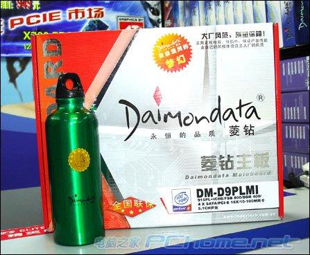 这是一个叫菱钻的品牌推出的主板,型号是DM-D9PLMI。采用915PL+ICH6芯片组,支持Intel LGA775接口的Prescott,Celeron D系列处理器。持800MHz,533MHz前端总线,板载2根DIMM插槽,支持双通道最大2GB DDR内存,主板提供1根PCIE X16和两根PCIE X1插槽。板载100M网卡,并提供6声道音效输出。