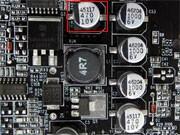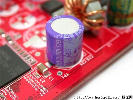 三洋电容的品质毋庸置疑,很多显卡都以其为卖点,上图显卡采用了贴片工艺的三洋电容,标志性的紫色是快速识别的好方法。