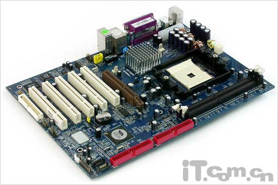主板提供了1条AGP 8x插槽和5条PCI插槽,虽然PCIe以有普及之势但在低端可供选择的AGP显卡更多,性价比也更加出色。通过处理器内建内存控制器的支持,主板提供了2条DIMM插槽,可最大支持到2GB的DDR400内存,但由于Socket 754的处理器平台已经属于AMD的低端产品,并未提供双通道的支持。存储方面,该主板提供了2个ATA133插槽和2个SATA插槽的支持,同前面采用VT8237R南桥的主板一样,也提供了磁盘阵列功能,可用于组建RAID0、RAID1、0+1等模式。