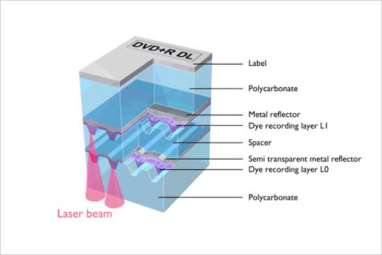 正如前文提到的那样,由于以后对于数据容量的要求越来越高,单面单层刻录技术的缺点也就暴露得越来越明显,所以针对这一缺陷单面双层刻录技术就蕴育而生。其实这一技术早在2003年10月就已经初见端倪,它是由飞利浦和三菱联合研制,它可以说是刻录技术上取得了又一次重大突破,该技术的最大特点那便是不需要将DVD盘片翻面的情况下,就可以实现将一张规格为4.7GB容量的DVD刻录光盘的容量翻倍,提升到8.5GB,即DVD+R DL规范,他们并将这种技术命名为“双层(DL,Double Layer)”技术,也称DVD+9。另外在飞利浦和三菱联合推出DVD+9规格同时,DVD Forum也推出了对应的DVD-R DL规范,也就是Dual Layer技术?也称DVD-9。这两种单面双层刻录的工作原理都是相同的,只是在一些小的技术上有所差异,不过实用效果上来看都差不多。由于市场推广的问题,目前在市面上销售的双层DVD刻录机以支持DVD+R/DVD-R DL规范和DVD+R DL规范的产品为主,消费者在购买时一定要注意,相信影响应该不会很大。