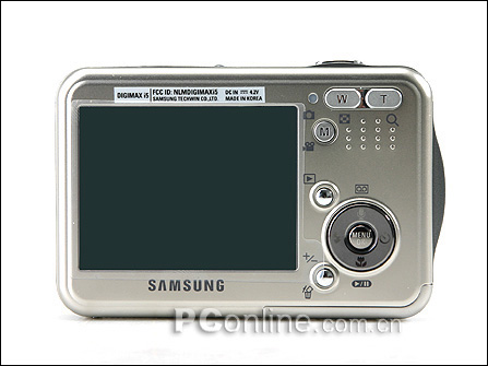 Digimax i5作为三星进攻超薄机市场的第一款机型,可谓出手不凡,其设计与功能参数都让人觉得相当厚道。首先是它的超轻薄体积,方便携带,其次不容忽视的是它占据背面2/3面积的2.5英寸,约23万象素彩色液晶显示屏,取景和回放细腻而清晰。再者,它全金属材料制造,并且融入了当今流行的磨砂工艺,机身圆角流线型设计,外表精致美观。性能方面:采用三星独家3倍光变SHD镜头,解析能力只能说是一般;1cm微距表现令人满意;短片方面支持最大分辨率为640×480尺寸,帧速率为30帧每秒的视频拍摄的同时可以光学变焦,还具备了图像稳定器功能来获取更加清晰的画面效果。不过据评测发现i5在视频拍摄时变焦会有声音断续的不流畅反应。还有要提提的是i5的SAFE FLASH(安全闪光灯)技术。它能在光线较暗的环境下,不使用闪光灯也能拍摄出较清晰的图像。原理是在这种模式下,i5会用特殊的算法处理图像,对手抖导致的模糊进行一定补偿。