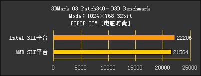 3DMark 03测试后的得分,Intel SLI平台比AMD平台高出643分。