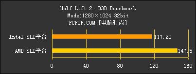 接下来轮到AMD拿手的游戏测试了,在Half-Life2的测试中,AMD SLI平台获得领先,并超过Intel SLI平台30.21帧。