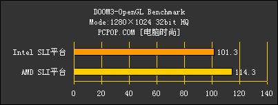 在DOOM3的测试中,AMD SLI平台依然获得领先,看来游戏的确是AMD的强项,而AMD则超过Intel SLI平台13帧。