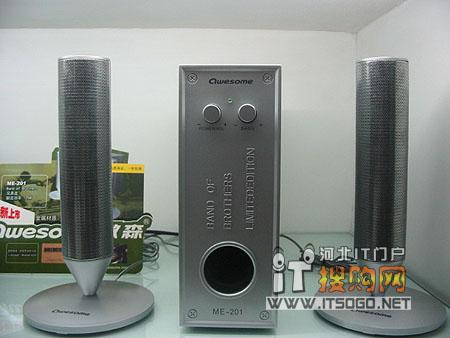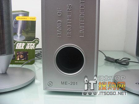 在主音箱的面板上刻有Band of Brothers的字样,不知道和《兄弟连》有没有关系。ME-201的箱体材料采用木质的,功率为20W+2,5Wx2。银色外观的金属质感设计总是给人一种喜悦。