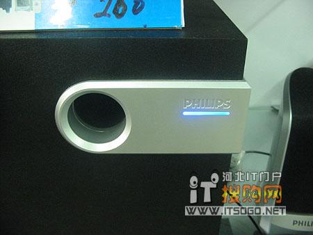 低音炮主面板设计有立体 的Philips标志,标志下设计有独特的蓝色线状电源指示灯。