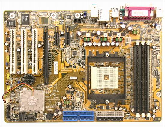 这块主板采用了黄色的PCB板,板型做工PCI-E架构,具有1个PCI-E X16插槽,2个PCI-E X1插槽,3个PCI插槽,主板整合了瑞昱REALTEK 公司RTL8201CL 10/100M网卡和ALC655 6声道声卡,足以满足日常所需。板上集成的SATA Host 时钟频率,能发出25MHz的稳定运行频率并支配SATA Host锁定在标准频率下,确保SATA设备的稳定工作。选用SATA硬件的用户要注意了!