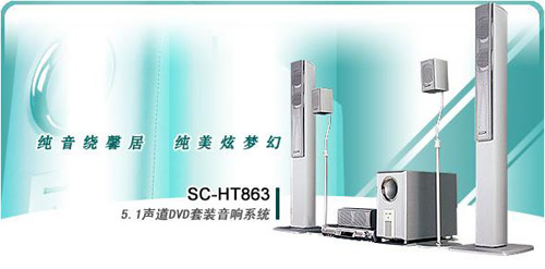 SC-HT863由功能强大的薄型化时尚主机+5只时尚卫星式音箱+大容量超重低音音箱组成。主机内置的DVD播放器、AM/FM收音、数码环绕声解码功能。其中DVD主机内置有54MHz/10bit DAC为DVD的视频解码,同时提供增强型逐行扫描视频输出(4:4:4色度补偿/4:3)。除了视频RCA、S端子外,更提供色差视频输出,以提供更出色的影像表现。