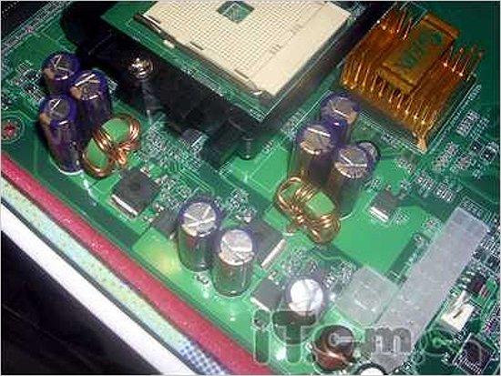 供电方面,同样是标配的三相供电,电容品质不错,数量也不算少。主板提供两个DIMM,最大支持2GB的DDR内存。