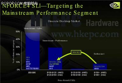 在NVIDIA最新的Roadmap中透露,他们有意把SLI技术进一步普及,除了容许Geforce 6600及Geforce 6600LE也支持SLI外,还计划降低nForce 4 SLI芯片的售价包括Intel及AMD平台,已往nForce 4 SLI及nForce 4 SLI Intel Edition主板,定价为0+(AMD)及190+(Intel),但NVIDIA计划把它们降至0美及0美元的水平,除了在芯片组上降价外,还需要主板厂商的支持,包括只用4层PCB、减少加入额外的功能等。
